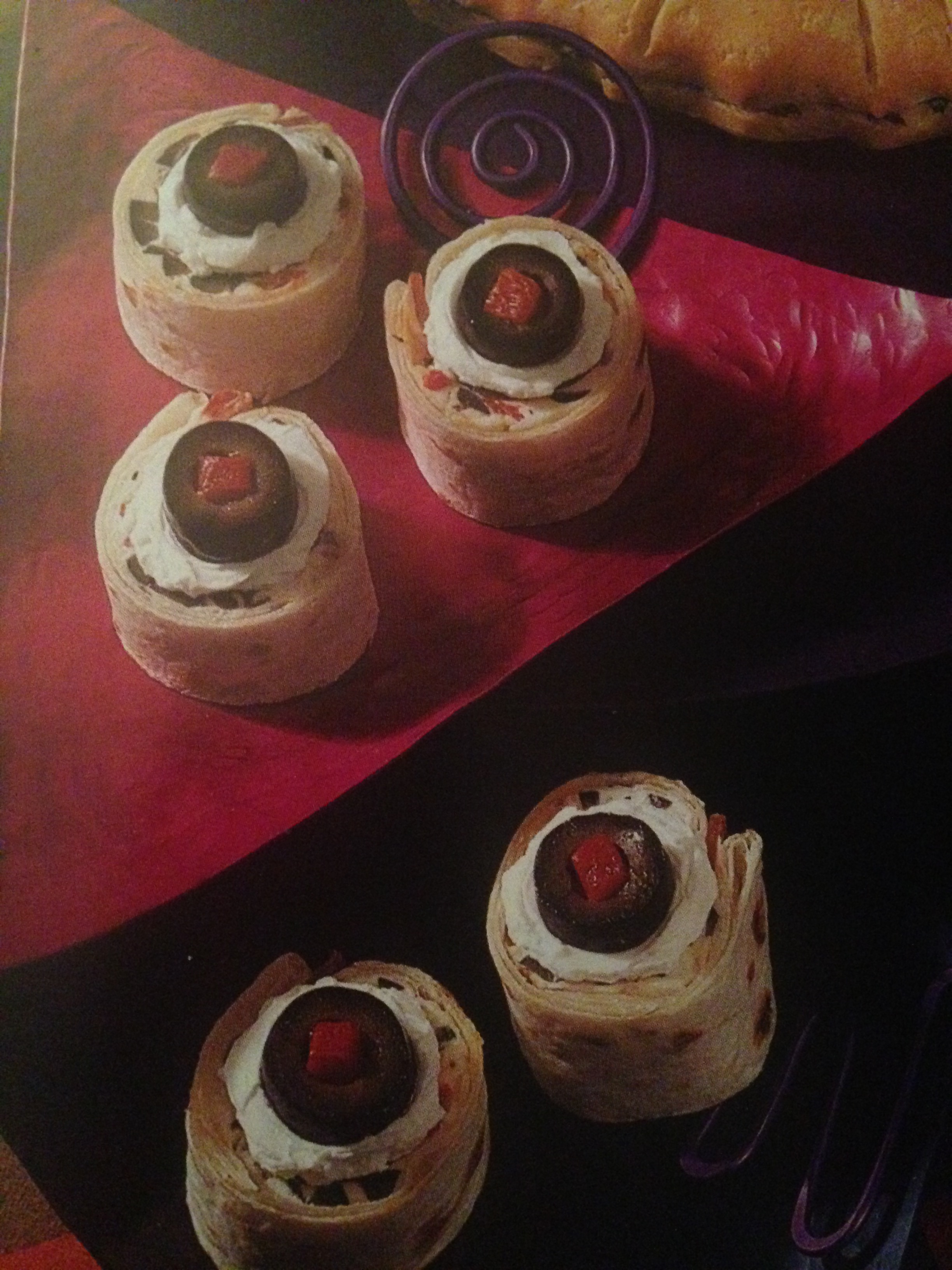 - Using reserved cream cheese, attach reserved olives and red pepper to make roll-ups look like eyes.