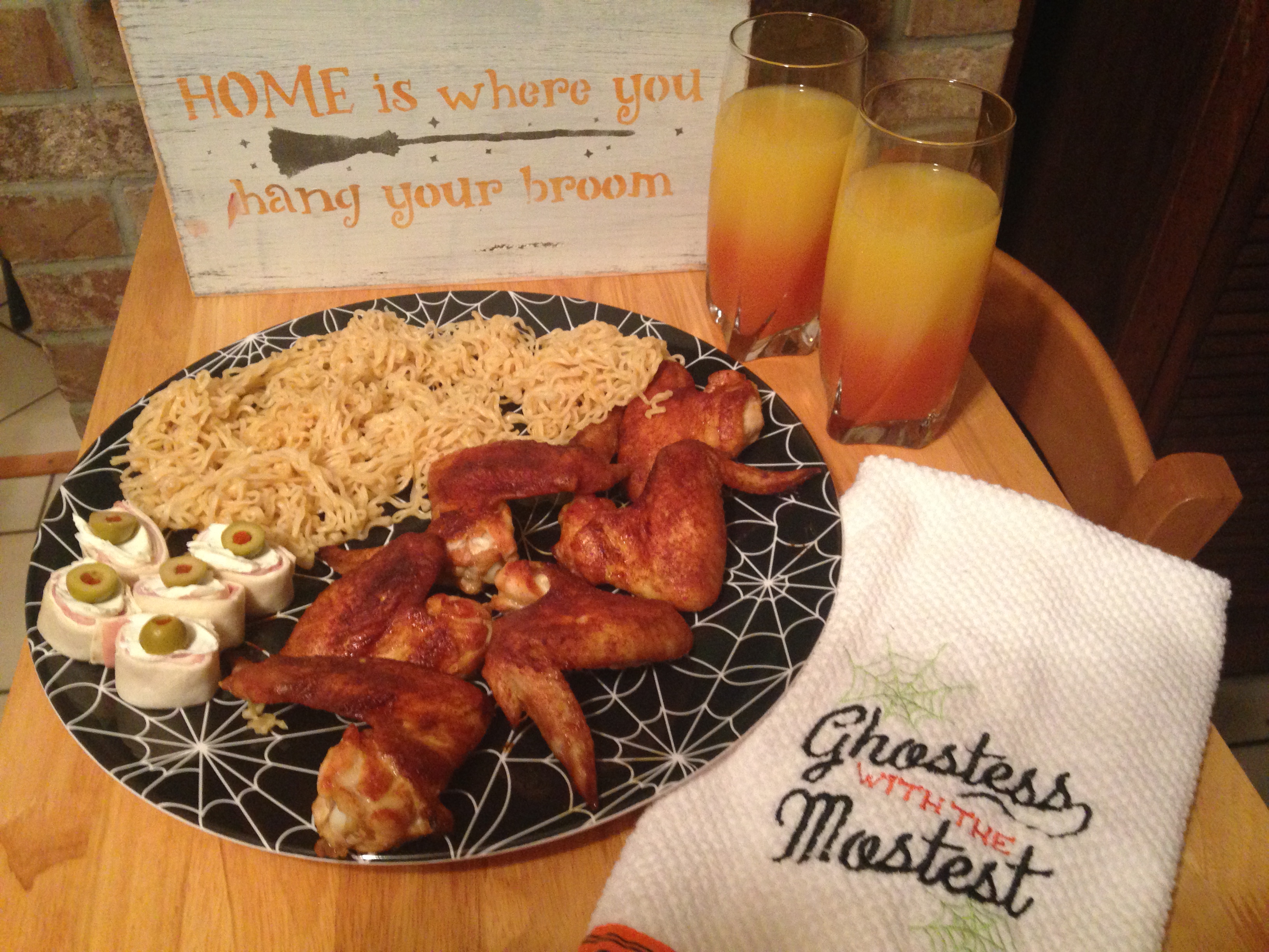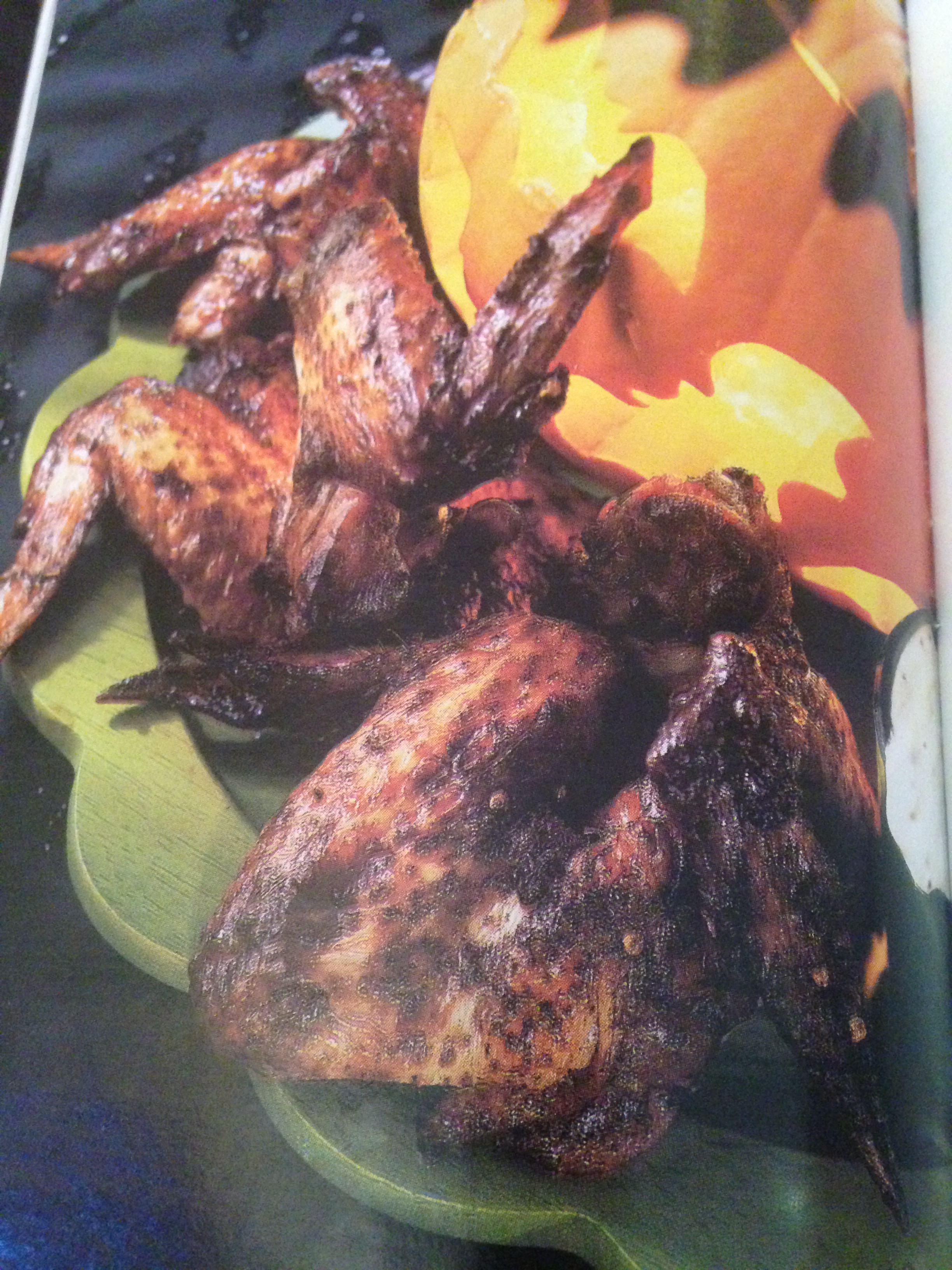 As you can see, my bat wings aren’t as dark as the ones in the above picture. I’ve never been able to get them that dark. Well, that’s not entirely true. The closest I ever came to getting my wings that dark is when I forgot to set the kitchen timer and went off to do something else. C’est la vie! You might also notice the little treats with green olives. Those are called Eye of Newt and were not on tonight’s planned menu. They are, however, the most popular of my Halloween cuisine and are made frequently and spontaneously during the 13 days. My daughter decided they needed to be made tonight. You, on the other hand, will have to wait until Saturday’s post to find out how to make them.