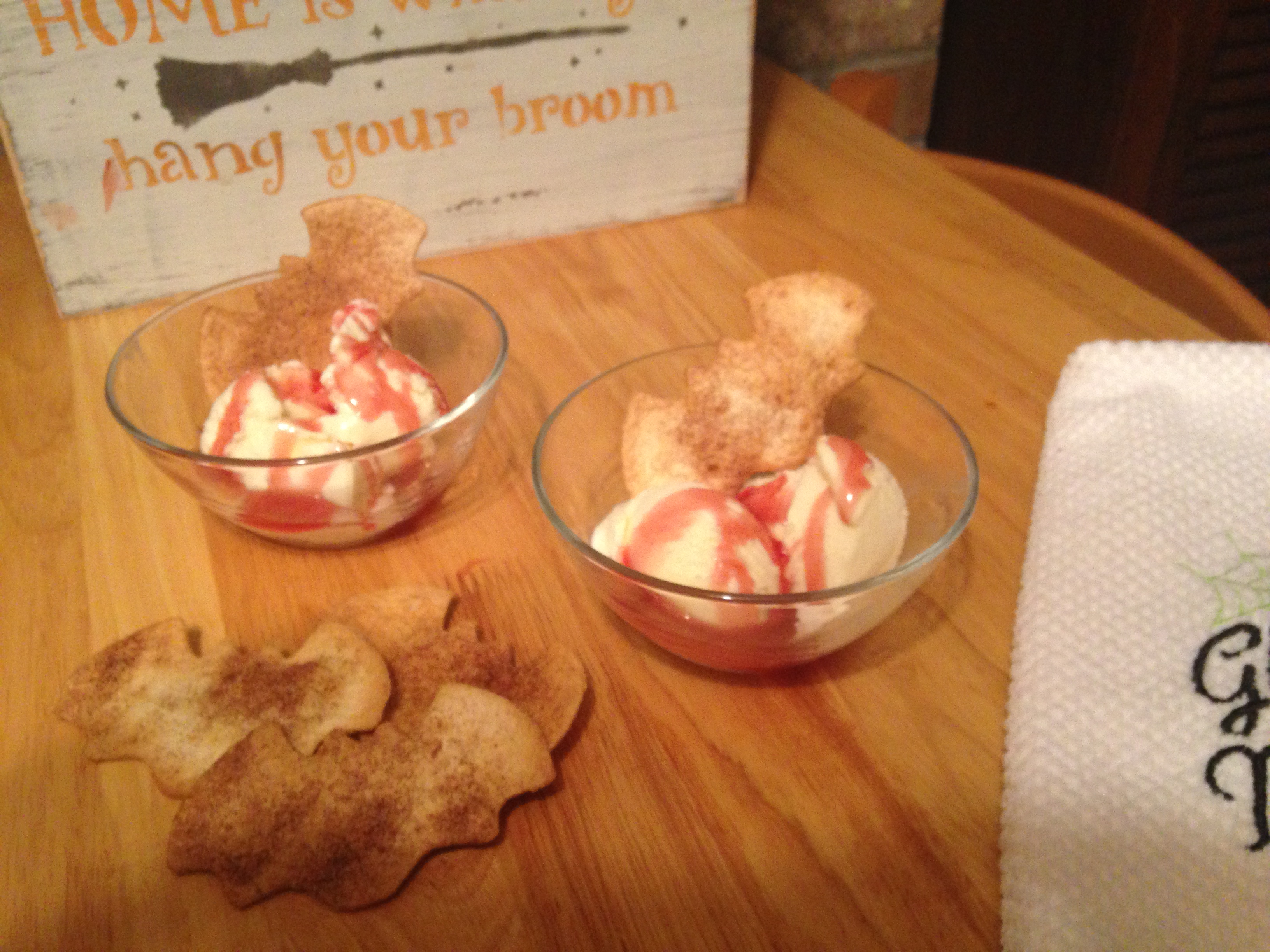 For the bloody ice scream, I simply scooped up some vanilla ice cream and drizzle strawberry syrup over it. Serve with bats.