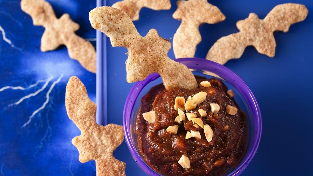 - Heat oven to 350°F. With bat-shaped cookie cutter or kitchen scissors, cut tortillas into bat shapes. Place shapes and large scraps on ungreased cookie sheets. Spray both sides of shapes and scraps with cooking spray. Sprinkle with cinnamon and sugar mixture.