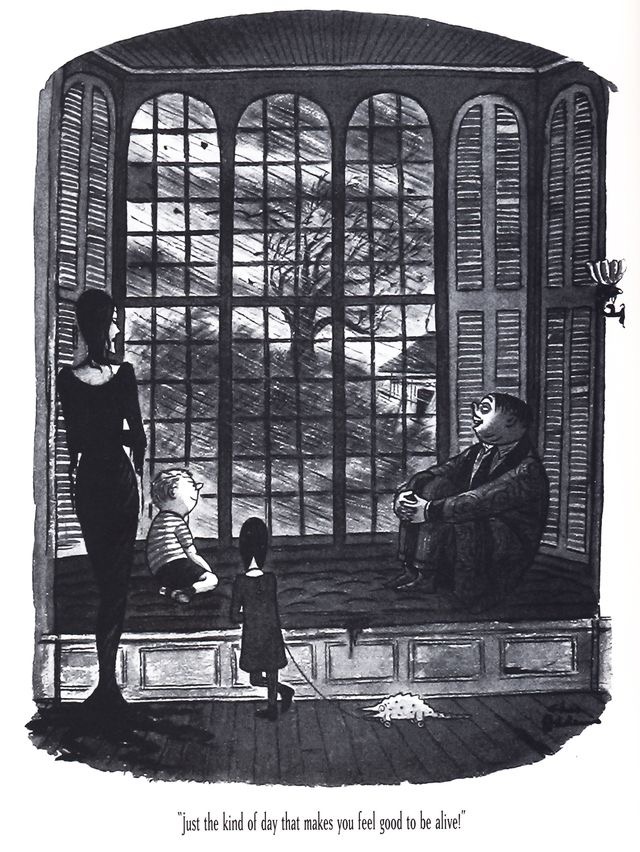 “. . . Addams’s most familiar comic trope is to take the familiar and invert it by having ordinary people calmly and nonchalantly harbor or act on aggressive, even homicidal, impulses. This type of humor is used extensively in his “Addams family” cartoons. In these, he creates an unfamiliar family which, except for its inverted values, acts quite normal.”