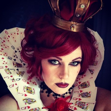 Annnnd I absolutely love this one! Attaching red rose petals to your face and making ’em bloody–genius! I love the bloody accent to one side of her lips as well–nice touch. And she’s right, with or without the creepy contact, this dark Queen of Hearts is fab.